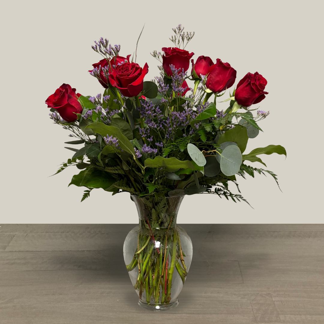 Nunan’s 18 Long Stem Roses arrangement features 18 long stem red roses, limonium and greens.