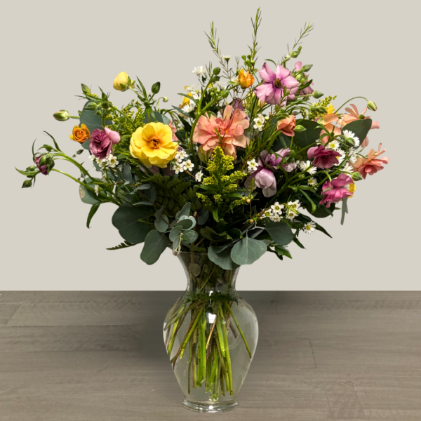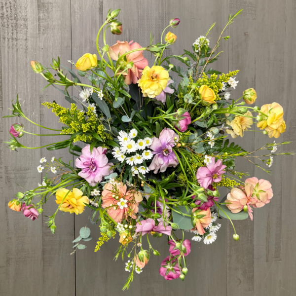 Nunan’s Butterfly Kisses arrangement features assorted butterfly ranunculus, white monte casino, solidago, white waxflower and greens.
