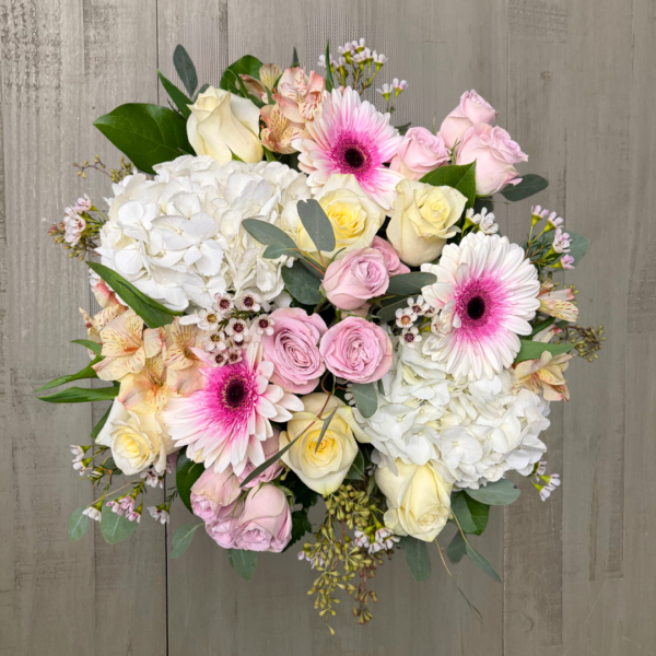 Nunan’s Candlelight Romance arrangement features white hydrangeas, pink spray roses, pale yellow roses, white/pink gerbera daisies, white waxflower and greens.
