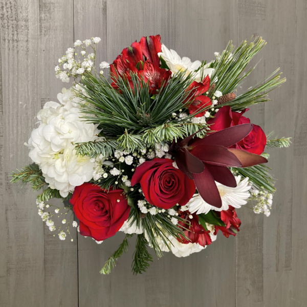 Nunan’s Candy Cane Lane arrangement features- red roses, white hydrangea, leucadendron, white mini gerbera daisies, white carnations, red alstroemeria, baby’s breath and mixed greens.