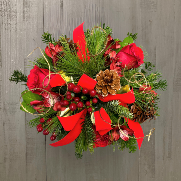 Nunan’s Chestnuts Roasting arrangement features- red roses, red hypericum, red alstroemeria, natural pine cones, ting ting, a red bow and mixed greens.