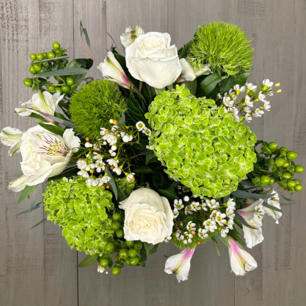 Nunan’s Green And White Delight arrangement features – green hydrangea, white roses, white alstroemeria, green trick, green hypericum, white waxflower and mixed greens.