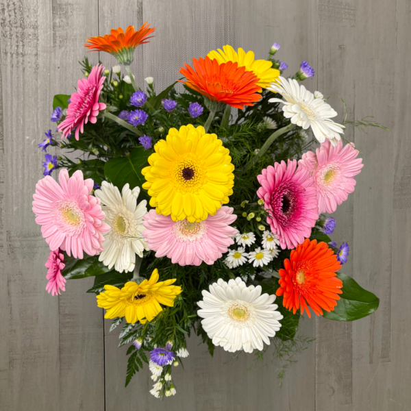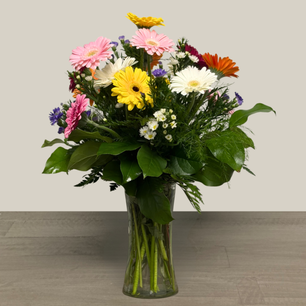 Nunan’s Happy Daisy arrangement features assorted mini gerbera daisies, filler and greens.