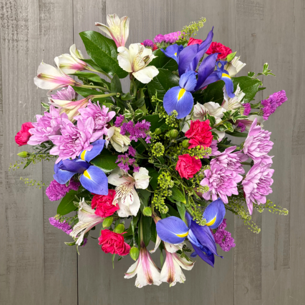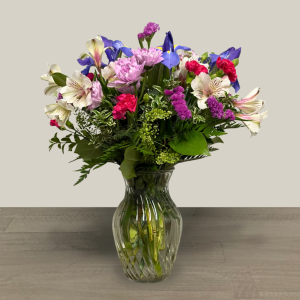 Nunan’s Iris Elegance arrangement features irises, pink tulips, white daisy poms, heather, lipedium, statice, lavender mini carnations and greens.