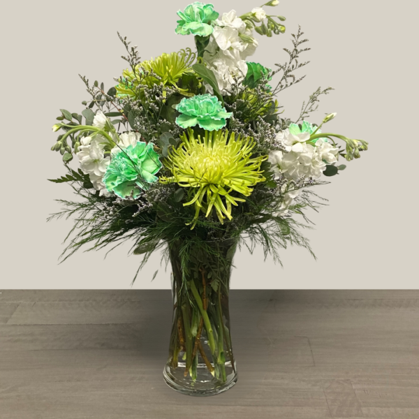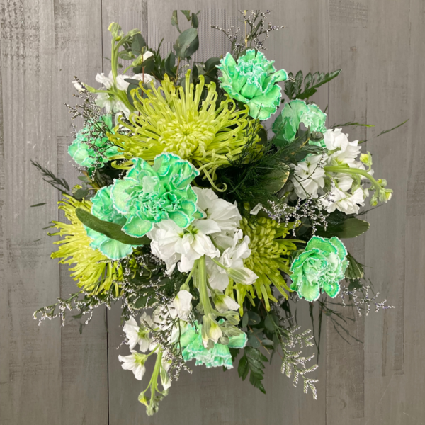 Nunan’s Kiss Me I’m Irish arrangement features – green carnations, green spider mums, white stock, limonium, and mixed greens.