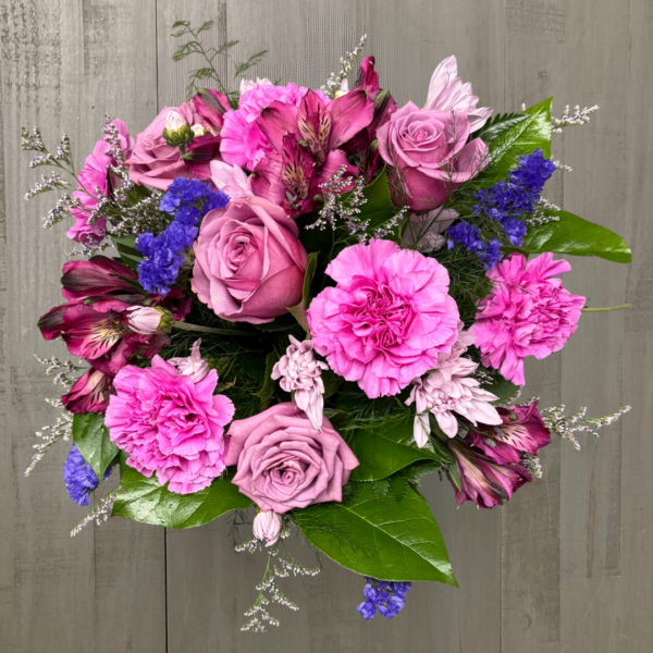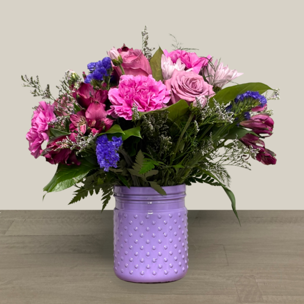 Nunan’s Lavender Love arrangement features lavender alstroemeria, lavender cushion poms, lavender carnations, lavender roses, purple statice, limonium and greens.