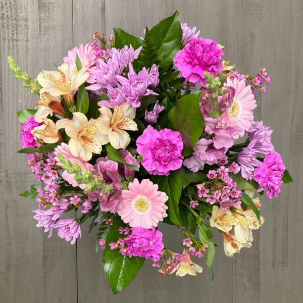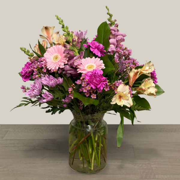 Nunan’s Lavender Mist arrangement features lavender snapdragons, pale yellow alstroemeria, pink gerbera daisies, lavender cushion poms, lavender carnations, pink waxflower and greens.