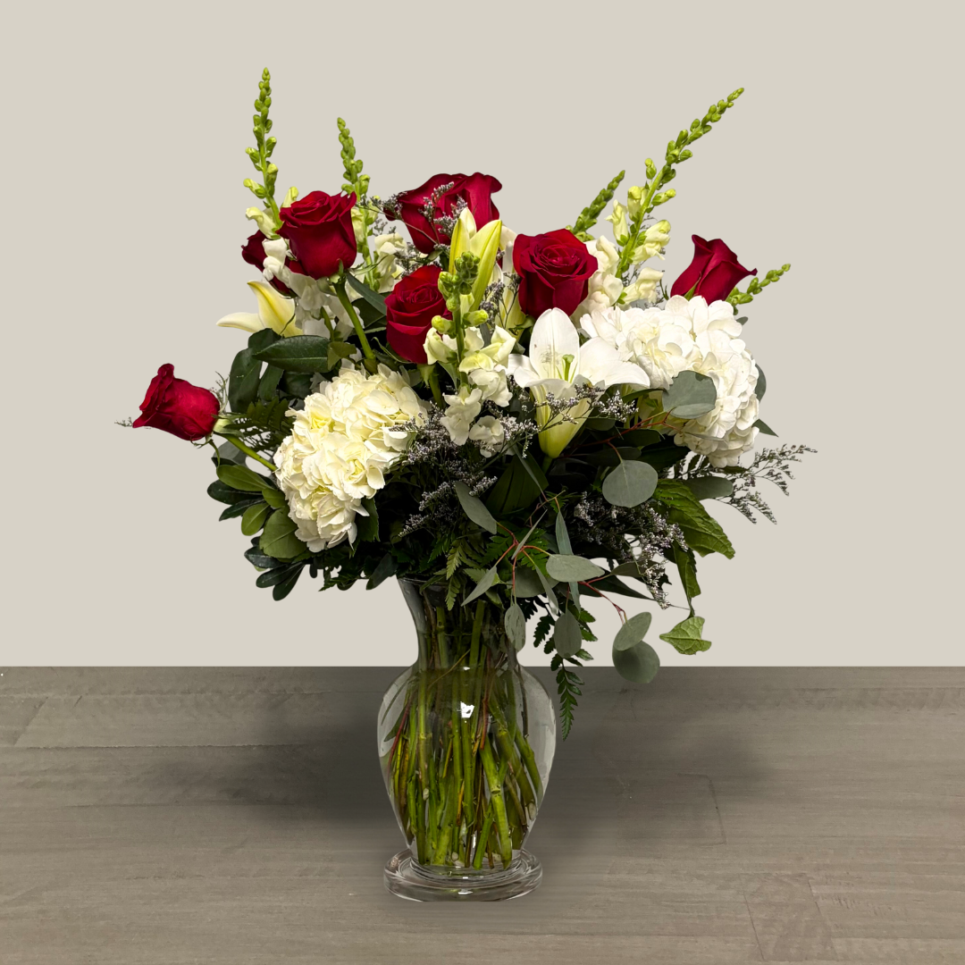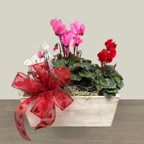 Nunan’s Let Our Love Grow arrangement features 3 mixed color cyclamen in a wooden container.