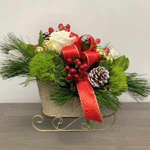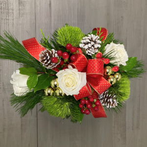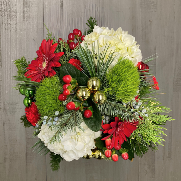 Nunan’s Merry and Bright arrangement features- red gerbera daisies, red hypericum berries, green trick, white hydrangea, burgundy mini carnations, green/red/gold balls and mixed greens.
