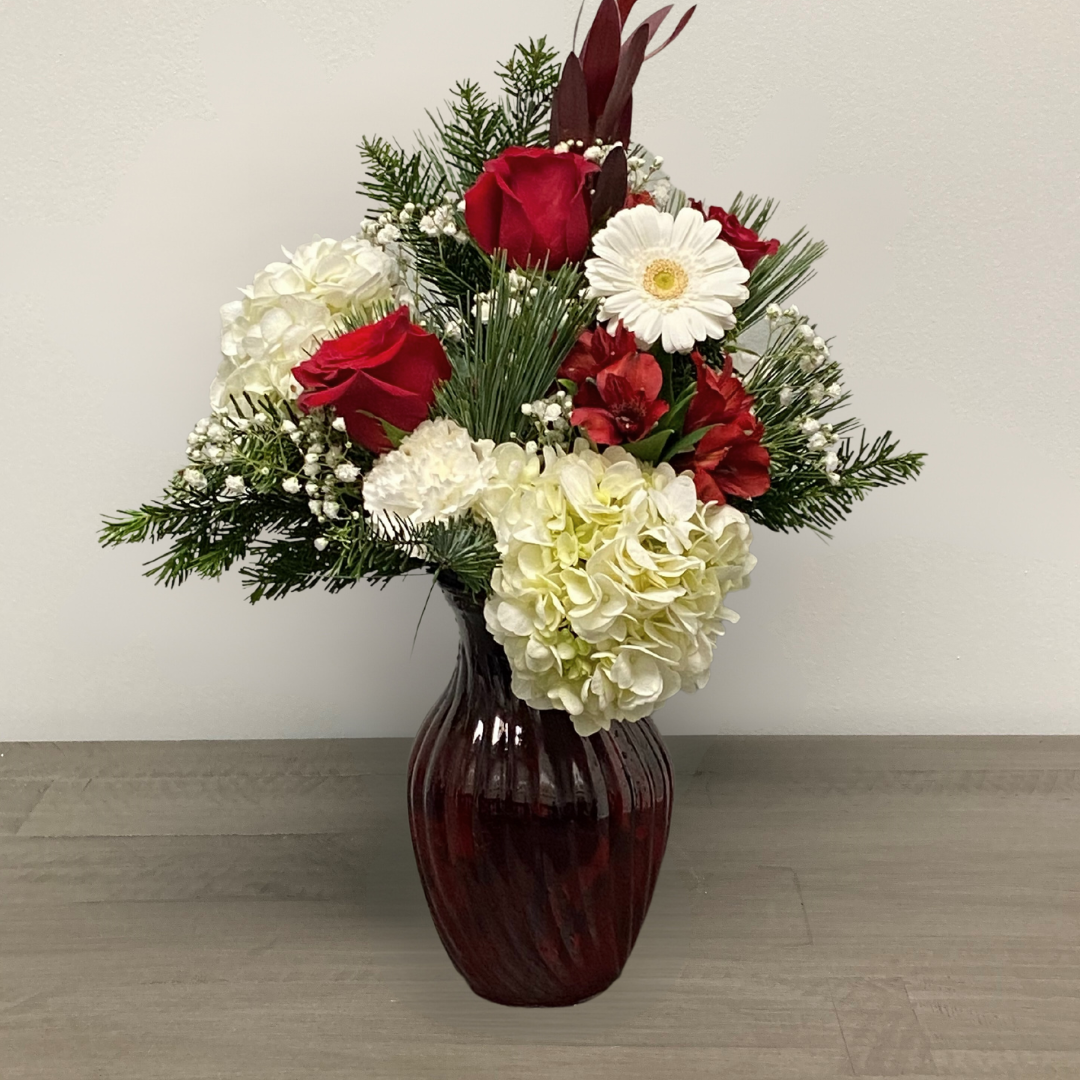 Nunan’s Merry and Bright arrangement features- red gerbera daisies, red hypericum berries, green trick, white hydrangea, burgundy mini carnations, green/red/gold balls and mixed greens.