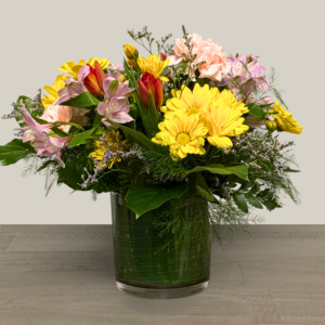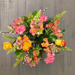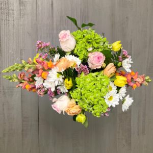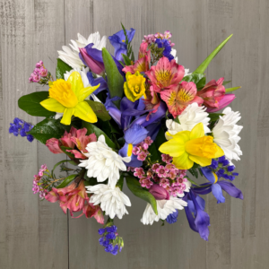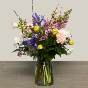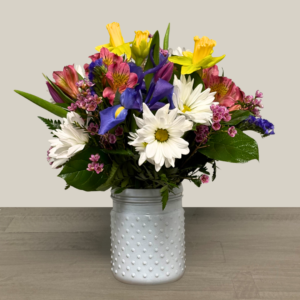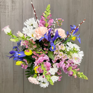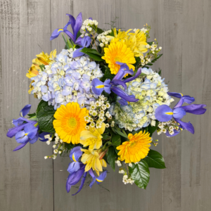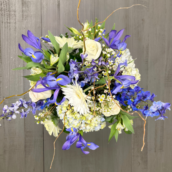 Nunan’s Morning Glory arrangement features blue delphinium, blue irises, blue hydrangeas, white gerbera daisies, white roses, white alstroemeria, curly willow and greens.