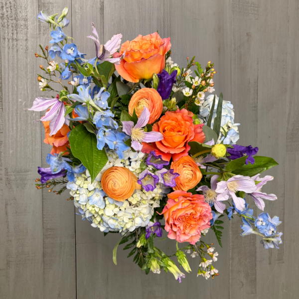 Nunan’s Pastel Elegance arrangement features lavender clematis, pink campanula, blue hydrangeas, coral roses, peach ranunculus, light blue delphinium, white waxflower and greens.