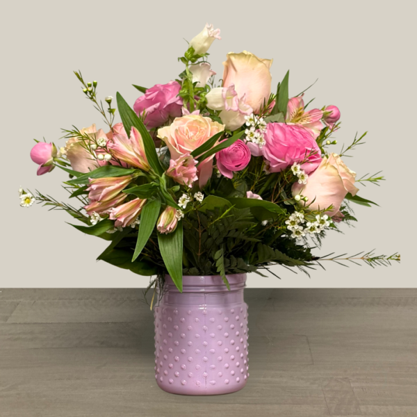 Nunan’s Pink Bubbles arrangement features pink alstroemeria, pink ranunculus, pink roses, pink spray roses, pink campanula, white waxflower and greens.