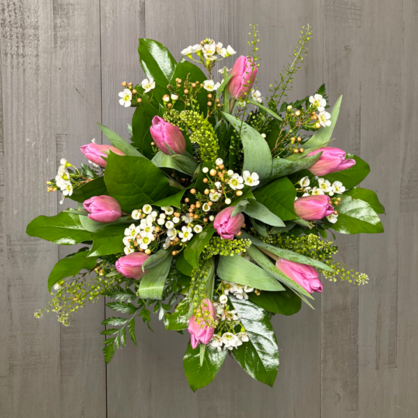 Nunan’s Pink Impression arrangement features pink tulips, white waxflower, lipedium green dragon and greens.