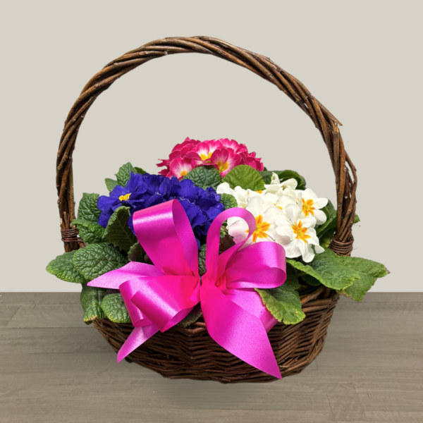 Nunan’s Prim and Proper arrangement features 3 mixed color primroses in a basket.