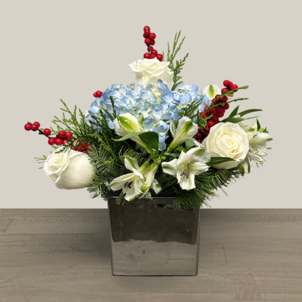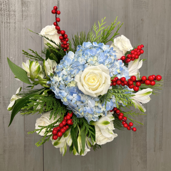 Nunan’s Snow Day arrangement features- blue hydrangea, white roses, white alstroemeria, red faux berries and mixed greens.