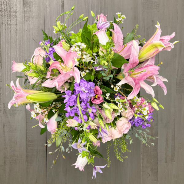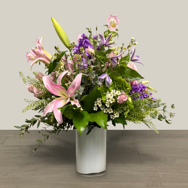 Nunan’s Spectacular Pink arrangement features green hydrangeas, pink oriental lilies, purple stock, pink campanula, lavender clematis, white waxflower, pink lisianthus, lipedium and greens.