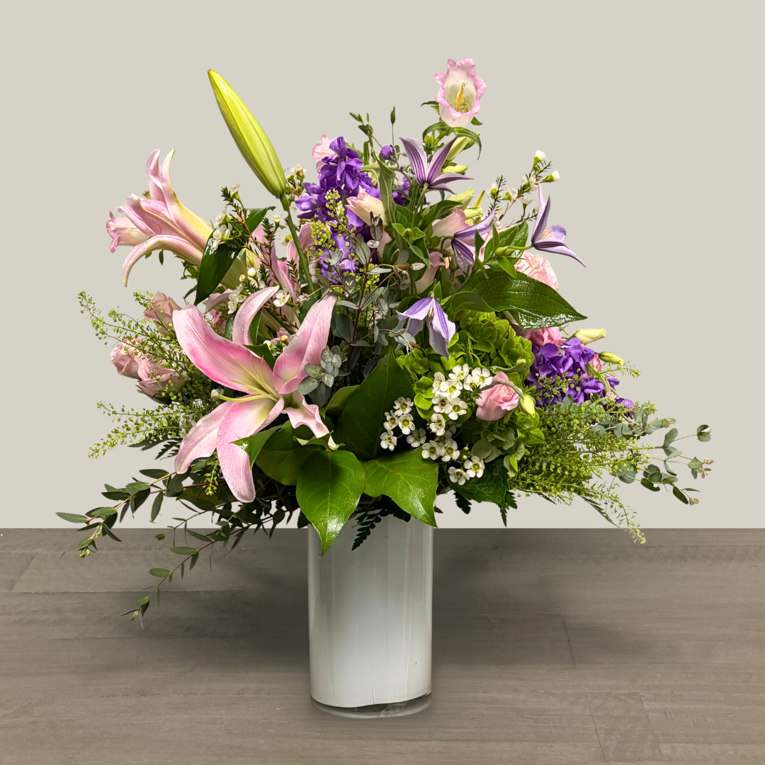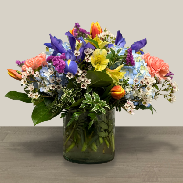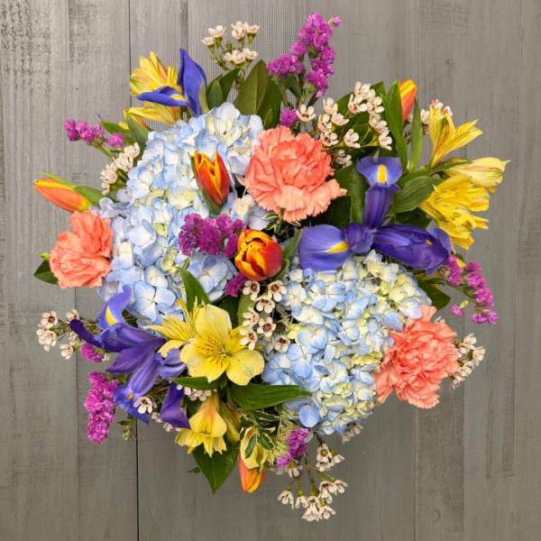 Nunan’s Spring Serenade arrangement features blue hydrangeas, irises, yellow/orange tulips, orange carnations, yellow alstroemeria, statice, white waxflower and greens.