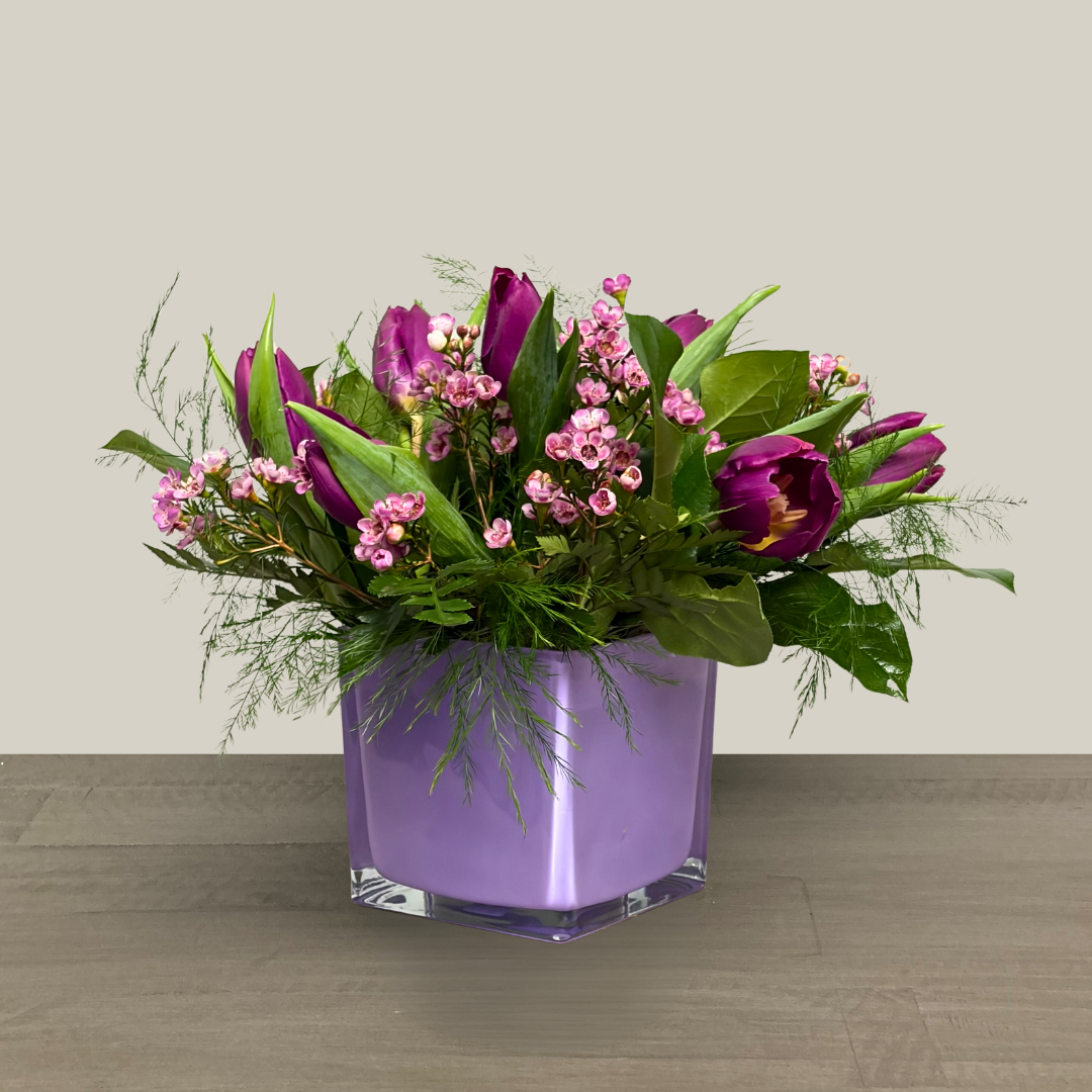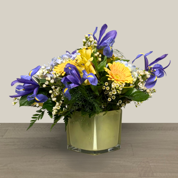 Nunan’s Spring Skies arrangement features blue irises, blue hydrangeas, yellow alstroemeria, mini yellow gerbera daisies, white waxflower and greens.