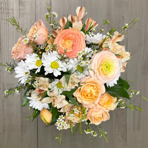 Nunan’s Sweet Peach arrangement features peach ranunculus, peach spray roses, white daisy poms, peach alstroemeria, white waxflower and greens.