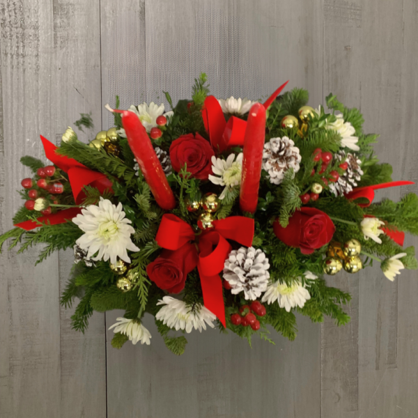 Nunan’s Toasty Embers arrangement features- red roses, red hypericum, white cushion poms, white tipped pine cones, gold millimeter balls, bows, 15″ red candles and mixed greens.